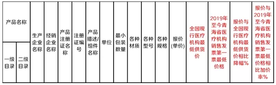 第二輪談判組根據(jù)申報(bào)企業(yè)的報(bào)價(jià)并參考企業(yè)提供的2019年至今青海省醫(yī)療機(jī)構(gòu)銷售發(fā)票第一票最低價(jià)格、全國(guó)現(xiàn)行醫(yī)療機(jī)構(gòu)最低供貨價(jià)進(jìn)行談判,議定的價(jià)格除以企業(yè)報(bào)價(jià)形成降幅,最后根據(jù)企業(yè)申報(bào)產(chǎn)品的平均降幅情況進(jìn)行排序,從高到低確定入圍廠家(品牌),國(guó)產(chǎn)企業(yè)入圍3家,進(jìn)口企業(yè)入圍3家。“申報(bào)產(chǎn)品報(bào)價(jià)表”中企業(yè)需要填寫的信息如下所示: