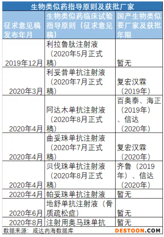 自2015年食品藥品監(jiān)管總局發(fā)布《生物類似藥研發(fā)與評價技術指導原則(試行)》以來,2019年起終于發(fā)表了一系列具體產品的生物類似藥臨床試驗設計指導原則。生物類似藥臨床試驗設計指導原則主要針對的是生物類似藥的上市標準。指導原則發(fā)布了,生物類似藥獲批的標準才有,生物類似藥才有可能獲批。