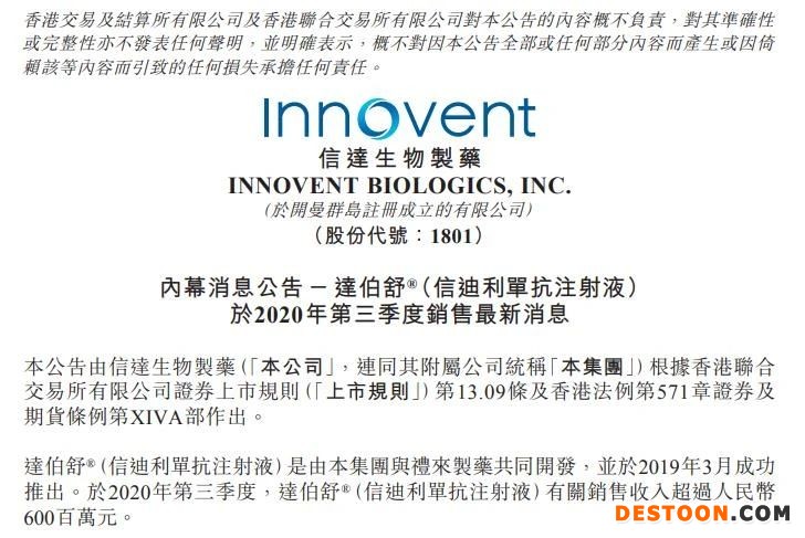 10月30日訊 日前,信達(dá)生物發(fā)布公告稱,其PD-1產(chǎn)品信迪利單抗注射液(商品名達(dá)伯舒)在2020年第三季度獲得了超6億人民幣的銷(xiāo)售業(yè)績(jī),加上此前公布的第一季度和第二季度的收入,信迪利單抗前三季度累計(jì)實(shí)現(xiàn)銷(xiāo)售收入超15億元,按此逐季增長(zhǎng)趨勢(shì),其本年度收入預(yù)計(jì)會(huì)超過(guò)20億元,相比較去年10.159億元的年銷(xiāo)售額,整整翻了一番。