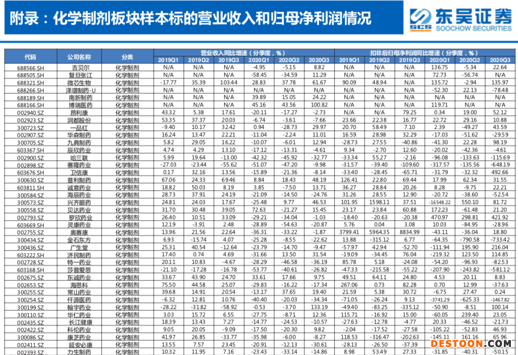 具體看化藥制劑企業(yè),2020Q1-3營業(yè)收入總額增長-2.7%,扣非后歸母凈利潤總額增長-0.7%。其中,2020Q3營業(yè)收入總額增長4.8%,扣非后歸母凈利潤總額增長17.8%,較2020Q2顯著回升。
