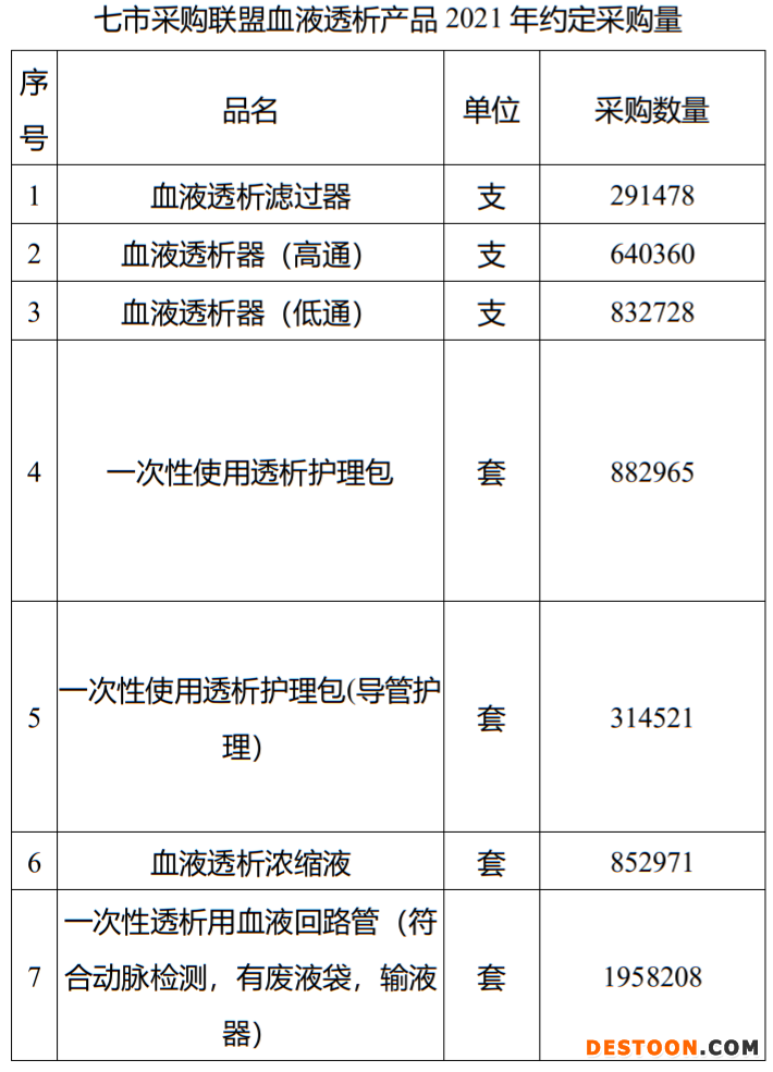 血液透析類產(chǎn)品具體包括血液透析濾過器、血液透析器(高通)、血液透析器(低通)、一次性使用透析護(hù)理包、一次性使用透析護(hù)理包(導(dǎo)管護(hù)理)、血液透析濃縮液、一次性透析用血液回路管(符合動脈檢測,有廢液袋,輸液器),總采購數(shù)量為577.3萬個。