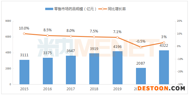 2020上半年,受“新冠”疫情影響,在人們盡量減少出行與消費(fèi)的情況下,2020上半年零售終端的藥品銷售規(guī)模出現(xiàn)負(fù)增長,但隨著人們生活逐漸恢復(fù)正常,經(jīng)濟(jì)回暖,預(yù)計(jì)2020全年零售終端的藥品規(guī)模將達(dá)到4322億元,同比去年增長3%。