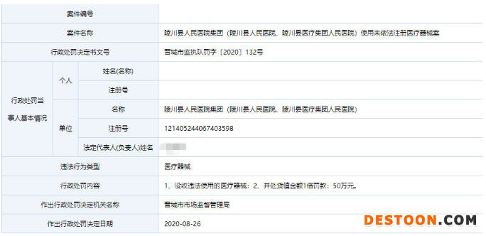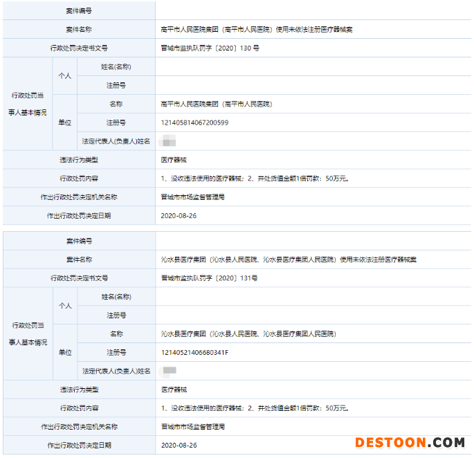 日前,晉城市市場監(jiān)督管理局發(fā)布3則處罰公示信息。高平市人民醫(yī)院集團(高平市人民醫(yī)院)、沁水縣醫(yī)療集團(沁水縣人民醫(yī)院、沁水縣醫(yī)療集團人民醫(yī)院)和陵川縣人民醫(yī)院集團(陵川縣人民醫(yī)院、陵川縣醫(yī)療集團人民醫(yī)院)因使用未依法注冊醫(yī)療器械,分別被作出同樣的處罰: