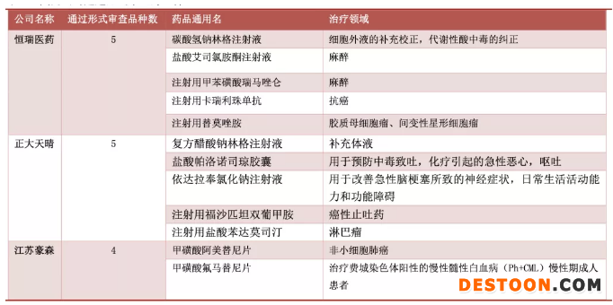與之對(duì)應(yīng)的是國內(nèi)企業(yè),恒瑞醫(yī)藥、正大天晴、江蘇豪森的數(shù)量居前,百濟(jì)神州、人福醫(yī)藥、歌禮制藥、興齊眼藥和科倫藥業(yè)各有2個(gè)品種通過形式審查,復(fù)星醫(yī)藥、君實(shí)生物、三生制藥、再鼎醫(yī)藥、智飛生物等各有1個(gè)品種通過形式審查。
