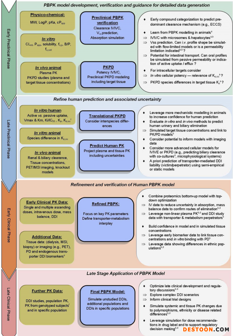 因?yàn)樵谀承┨囟ńM織器官中,該模型使用了特定的參數(shù)和微分方程,這也使得在一些藥物并用或聯(lián)合給藥治療的情況下,可以去預(yù)測有無誘導(dǎo)劑或抑制劑存在情形的特殊族群藥代動(dòng)力學(xué)特點(diǎn),這為其在新藥研發(fā)策略的提供,臨床試驗(yàn)方案設(shè)計(jì)和提高臨床試驗(yàn)成功率方面提供了重要參考價(jià)值和指導(dǎo)意見。來自禮來,默克,羅氏等國際制藥先端企業(yè)的科學(xué)家也為PBPK建模在公司新藥研發(fā)應(yīng)用的流程做出了詳細(xì)歸納和總結(jié)[4]。