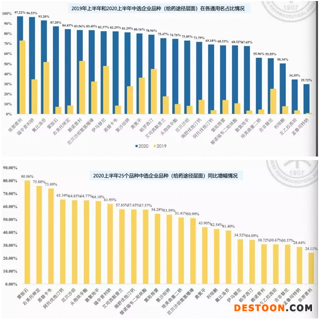 另外,各品種中選企業(yè)的供應(yīng)量占比在2020年上半年有明顯增幅,其中蒙脫石同比增幅80.06%、右美托咪定同比增幅75.88%,恩替卡韋同比增幅73.89%,阿托伐他汀鈣同比增幅65.34%,厄貝沙坦同比增幅64.85%,頭孢呋辛酯同比增幅64.77%??梢钥闯觯魇》輲Я坎少徴邔嵤┬Ч@著。