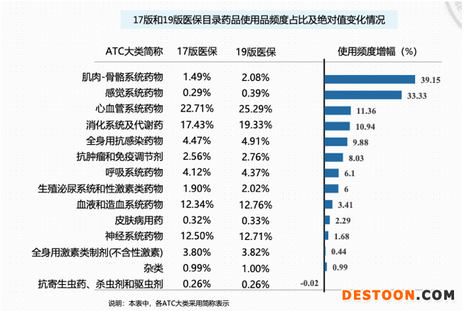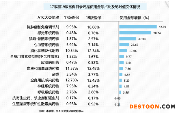 以2020年上半年數(shù)據(jù)為基礎(chǔ),對比17版與19版醫(yī)保藥品目錄,整體品種數(shù)增幅12.77%,其中腫瘤免疫調(diào)節(jié)藥品品種增幅達(dá)64.44%,心血管系統(tǒng)藥物品種增幅達(dá)20.18%,肌肉-骨骼肌系統(tǒng)藥物品種增幅達(dá)15.91%,全身用激素類制劑品種增幅達(dá)15.39%。