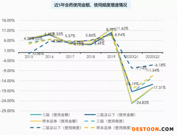 另外,由于受新冠肺炎疫情影響,2020年第一季度,全藥使用金額和使用頻度大幅下降。其中,使用金額同比下降24.83%,使用頻度同比下降18.19%;第二季度稍有緩解,使用金額同比下降17.31%,使用頻度同比下降11.54%,但仍未恢復(fù)去年同期水平。