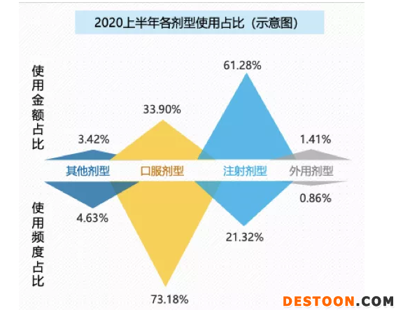 《報告》指出,2020年上半年,全藥不同劑型中,注射劑型使用金額占比最高,達(dá)61.28%;口服劑型使用頻度占比最高,達(dá)73.18%。
