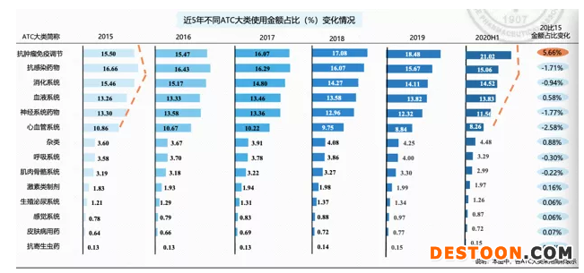 2020年上半年,心血管系統(tǒng)用藥使用頻度占比繼續(xù)升高,抗腫瘤和免疫調(diào)節(jié)劑使用頻度占比則有所下降。
