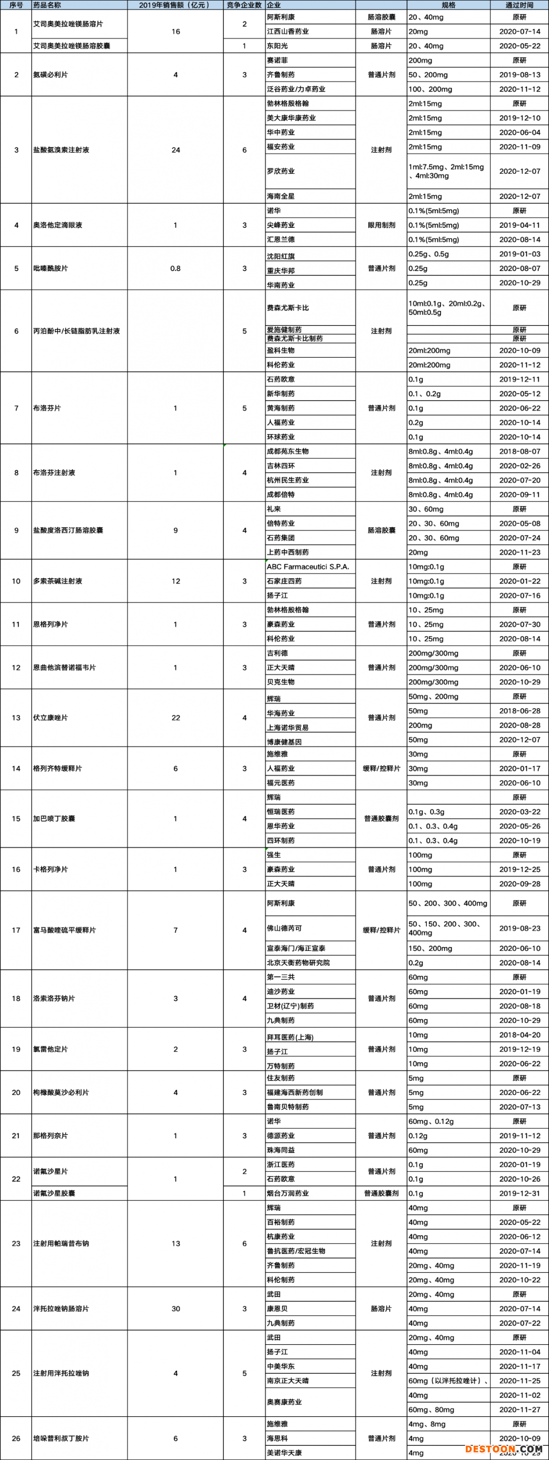 與此同時,石藥也有6個品種進入,分別是布洛芬片、鹽酸度洛西汀腸溶膠囊、諾氟沙星片、注射用硼替佐米、鹽酸普拉克索片、替格瑞洛片。接下來的正大天晴、豪森、東陽光、科倫等,涉及品種分別為6、4、3、3。