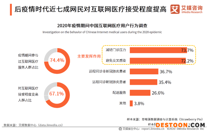 2020年新冠疫情影響下,居民對(duì)于醫(yī)藥電商、互聯(lián)網(wǎng)醫(yī)療平臺(tái)使用需求進(jìn)一步提升。艾媒咨詢數(shù)據(jù)顯示,74.4%的中國(guó)網(wǎng)民在疫情期間參與過(guò)在線問(wèn)診、醫(yī)藥電商或互聯(lián)網(wǎng)健康咨詢等互聯(lián)網(wǎng)醫(yī)療服務(wù),67.1%的網(wǎng)民表示對(duì)互聯(lián)網(wǎng)醫(yī)療接受程度有所提升。