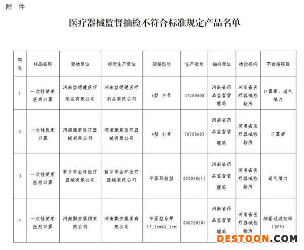 1.河南益德健醫(yī)療用品有限公司生產(chǎn)的1批次一次性使用醫(yī)用口罩,規(guī)格型號:A型大號,生產(chǎn)日期:2020年4月8日,生產(chǎn)批號:37200408,不合格項目:口罩帶、通氣阻力。
