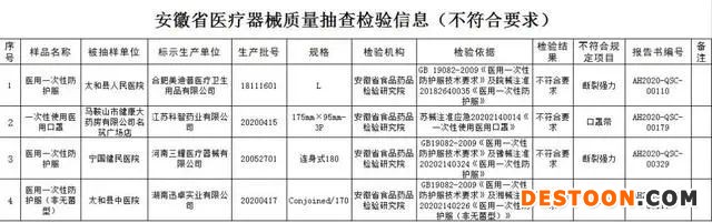 其中,在太和縣人民醫(yī)院抽樣的,標(biāo)示為合肥美迪普醫(yī)療衛(wèi)生用品有限公司生產(chǎn)的醫(yī)用一次性防護服,生產(chǎn)批號18111601,規(guī)格L;寧國健民醫(yī)院抽樣的,標(biāo)示為河南三耀醫(yī)療器械有限公司生產(chǎn)的醫(yī)用一次性防護服,生產(chǎn)批號20052701,規(guī)格連身式180;太和縣中醫(yī)院抽樣的,標(biāo)示為湖南迅卓實業(yè)有限公司生產(chǎn)的醫(yī)用一次性防護服(非無菌型),生產(chǎn)批號20200417,規(guī)格Conjoined/170;均斷裂強力不符合要求。