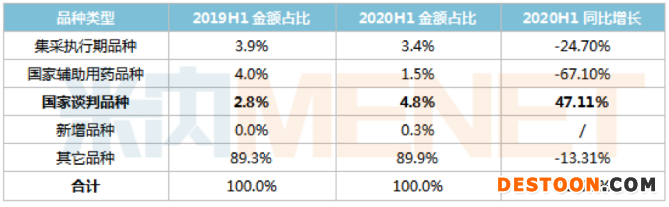 米內(nèi)網(wǎng)數(shù)據(jù)顯示,2020上半年盡管在疫情的沖擊下,國家談判品種的銷售額仍呈現(xiàn)出快速的增長勢頭,同比增長了47.11%,銷售額占比也由2019上半年的2.8%上升至2020上半年的4.8%,可見該類品種以價換市場的通道得以打開,市場發(fā)展空間較大。