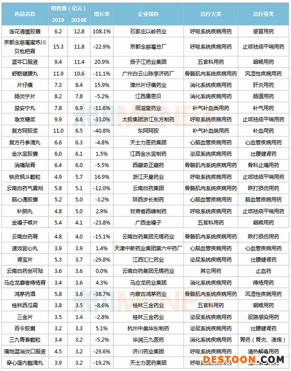 2個獨(dú)家中成藥首次突破10億元,為石家莊以嶺藥業(yè)的連花清瘟膠囊(增速108.1%)及揚(yáng)子江藥業(yè)的藍(lán)芩口服液(增速20.9%),其中連花清瘟膠囊將取代京都念慈菴蜜煉川貝枇杷膏成為2020E中國城市實體藥店終端最暢銷的獨(dú)家中成藥。