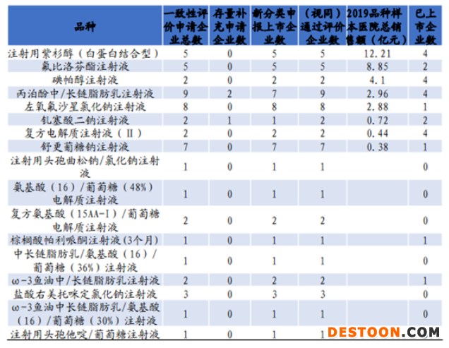 從科倫藥業(yè)申報(bào)上市的品種來看,可以分為兩大類型,一是各腫瘤及普通疾病適應(yīng)癥用藥的注射液,此類型注射劑的市場潛力較大,但相應(yīng)地,申報(bào)一致性評價(jià)的企業(yè)數(shù)量也多,競爭較激烈;二是葡萄糖、電解質(zhì)、氨基酸、魚油中長鏈脂肪乳等營養(yǎng)補(bǔ)充類型的注射液,此類細(xì)分領(lǐng)域的注射劑其市場潛力雖然小,但是過評企業(yè)也少,還有部分品類仍未上市,類同細(xì)分賽道的“藍(lán)海”。