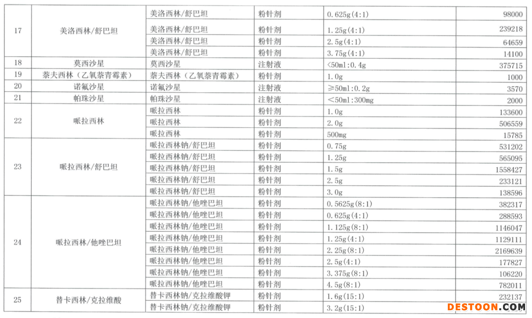 剩余的28個(gè)品種,抗生素占據(jù)絕大多數(shù),且基本都是注射劑,最終的報(bào)量結(jié)果也普遍較高:比如阿莫西林/克拉維酸三個(gè)規(guī)格的總報(bào)量超過1000萬支。