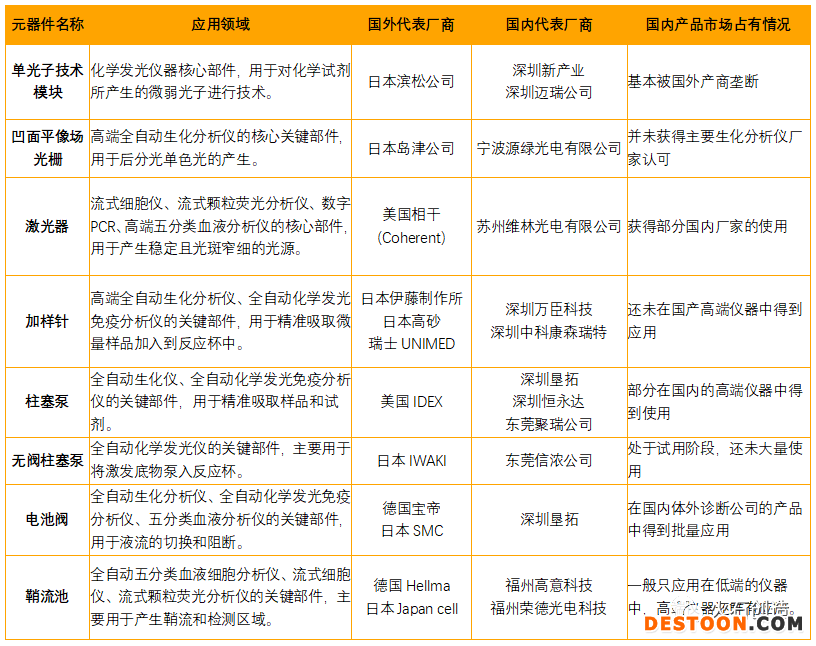 IVD儀器領(lǐng)域被關(guān)注的程度不如試劑原材料那么高,主要由于比較成熟的領(lǐng)域(如生化試劑領(lǐng)域),儀器基本處于開(kāi)放狀態(tài),國(guó)產(chǎn)廠家的試劑只要去適配市面上現(xiàn)有的儀器即可,而高端的體外診斷設(shè)備和試劑基本上是一體化的封閉體系,這就會(huì)導(dǎo)致各個(gè)廠家的儀器都是非標(biāo)準(zhǔn)化的設(shè)計(jì),沒(méi)有較為統(tǒng)一的標(biāo)準(zhǔn)。此外,由于IVD的儀器是多學(xué)科交叉的領(lǐng)域,整合了高速自動(dòng)化、精密光學(xué)、非標(biāo)結(jié)構(gòu)、集成電路、流體力學(xué)和生物學(xué)等多種學(xué)科,同時(shí)體外診斷儀器開(kāi)發(fā)的人員在初始階段幾乎都是從其他電子儀器行業(yè)轉(zhuǎn)行過(guò)來(lái)的,對(duì)于診斷儀器這種多學(xué)科交叉的儀器開(kāi)發(fā)訓(xùn)練不夠系統(tǒng),對(duì)于相關(guān)的法律法規(guī)也不夠熟悉,因此只有幾個(gè)頭部的企業(yè)才有實(shí)力去開(kāi)發(fā)與試劑相應(yīng)的大型配套儀器,中小廠家的IVD儀器開(kāi)發(fā)主要分布在小型或自動(dòng)化程度較低的POCT儀器上為多。該領(lǐng)域國(guó)內(nèi)比較缺乏的核心元器件如表2所示,目前國(guó)內(nèi)核心元器件生產(chǎn)能力缺乏的原因主要還是加工的工藝達(dá)不到足夠的精度造成的。