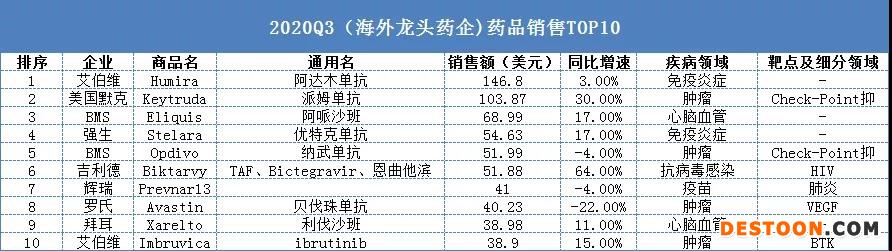 如果說上述藥品因?yàn)?020年獲批的新藥而導(dǎo)致銷售體量不大,那么2020年最暢銷的Top10,可以從全球跨國(guó)藥企Q3季度報(bào)中看出。