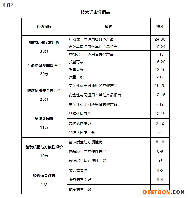 技術評審。組織專家對每個申報產(chǎn)品(同品種涉及兩個品規(guī)的,由企業(yè)自行選擇一個品規(guī))的臨床使用療效、產(chǎn)品質(zhì)量可靠性、臨床使用安全性、品牌認同度、包裝質(zhì)量與方便性、服務信譽等進行評審,具體的分值如下表。