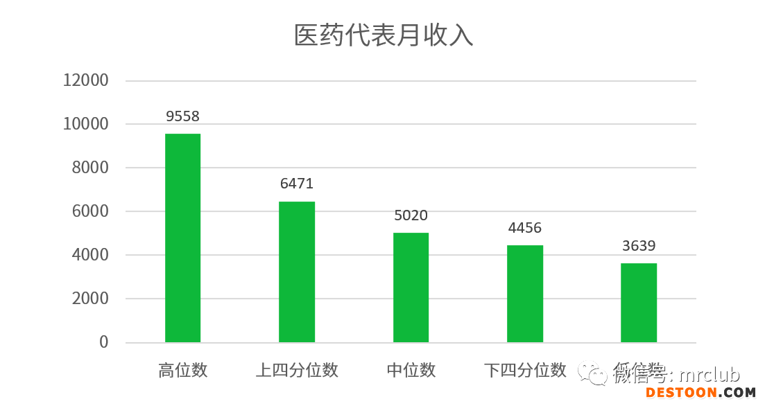 從結(jié)果看,醫(yī)藥代表月收入的高位數(shù)是 9558 元,低位數(shù)是 3639 元,中位數(shù)是 5020 元。