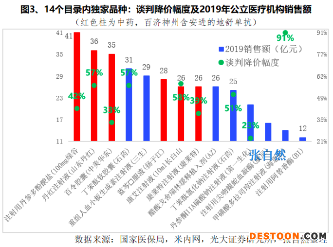 本次談判充分踐行了騰籠換鳥的醫(yī)??刭M舉措,119個談判成功品種的醫(yī)?;鸹究捎杀敬文夸泝?nèi)踢出和降價的品種基金占用來抵消,本次除踢出29個目錄內(nèi)的品種外,還將其中14個大品種重新談判,結(jié)果平均降幅43.46%,這14個品種僅在2019年公立醫(yī)療機構(gòu)的銷售額就已達(dá)360多億元,其中,中藥6個、西藥8個,近八成(11個)是注射劑,年銷售超過30億元的有4個,其中3個是中藥,年銷售最小的12億元(勃林格殷格翰的注射用阿替普酶),最大的達(dá)41億元(上海綠谷制藥的注射用丹參多酚酸鹽)。