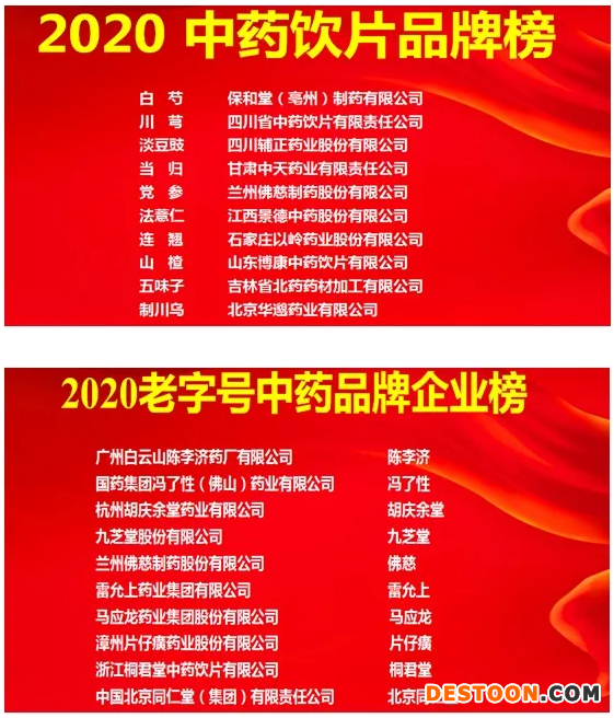 在第二屆中國中藥品牌建設大會上,中國中國協(xié)會公布了2020臨床價值中成藥品牌榜、中藥飲片品牌榜、中藥飲片品牌企業(yè)榜、老字號中藥品牌企業(yè)、中藥上市公司20強、中成藥企業(yè)100強六個榜單。