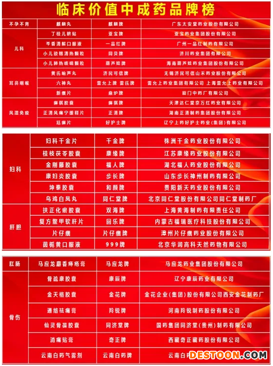 其中,臨床價值中成藥品牌榜分心血管、眼科、腫瘤、消化、腎病、腦病、呼吸、骨傷、肝膽、婦科、耳鼻咽喉、兒科等疾病領域,遴選了一批知名中成藥——如丁桂兒臍貼、黃芪響聲丸、婦科千金片、茵梔黃口服液、馬應龍麝香痔瘡膏、云南白藥氣霧劑、板藍根顆粒、感冒清熱顆粒、藿香正氣口服液、金花清感顆粒、血必凈注射液、安宮牛黃丸、復方血栓通膠囊等。