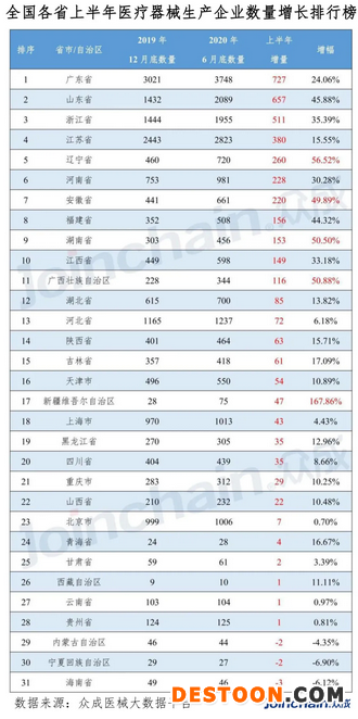 從全國(guó)各省企業(yè)數(shù)量增長(zhǎng)來(lái)看,2020上半年河南省醫(yī)療器械生產(chǎn)企業(yè)增加228家,全國(guó)排名第六。從全國(guó)各省企業(yè)數(shù)量增速來(lái)看廣西以50.9%排名第三。