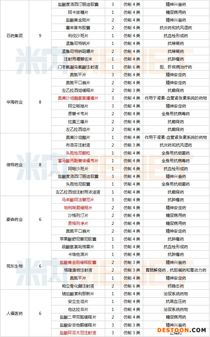 揚(yáng)子江藥業(yè)集團(tuán)、東陽光藥并列第四,均有13個品種獲批;石藥集團(tuán)有9個品種獲批;華海藥業(yè)、倍特藥業(yè)均有8個品種獲批;豪森藥業(yè)、苑東生物及人福醫(yī)藥這3家藥企各有6個品種獲批。