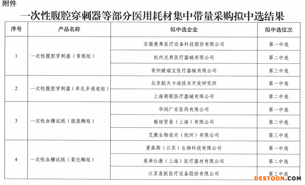 同時(shí)南京市醫(yī)保局發(fā)布《一次性腹腔穿刺器等部分醫(yī)用耗材集中帶量采購(gòu)擬中選結(jié)果公示》顯示,本次擬中選企業(yè)包括雅培、華潤(rùn)、魚(yú)躍醫(yī)療等械企。