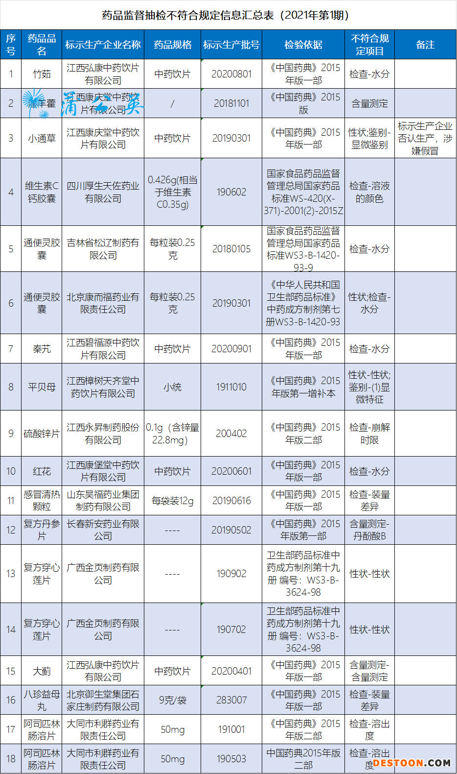 經(jīng)核查確認(rèn),本期監(jiān)督抽檢信息公布如下:15個品種18批次不符合標(biāo)準(zhǔn)規(guī)定(詳見附件),不符合規(guī)定項目包括性狀、檢查、含量測定等。