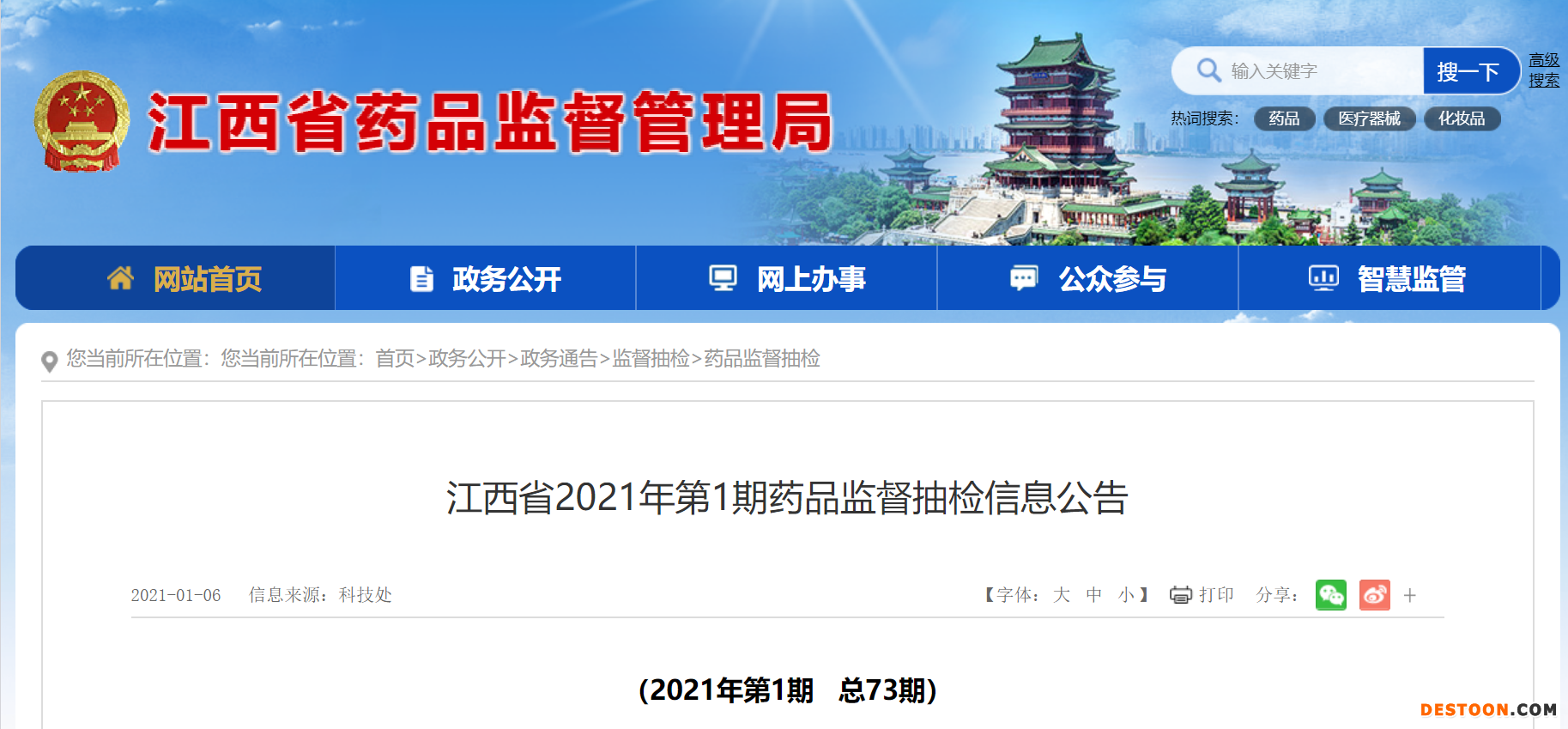 1月8日訊 2021年1月6日江西省藥監(jiān)局發(fā)布江西省2021年第1期藥品監(jiān)督抽檢信息公告。共有15個品種18批次不符合標(biāo)準(zhǔn)規(guī)定。