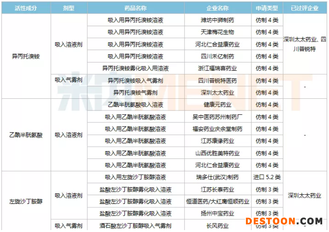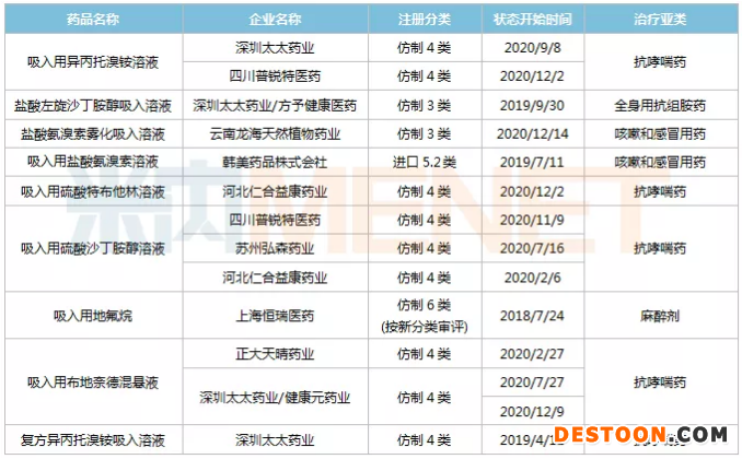異丙托溴銨吸入溶液劑、乙酰半胱氨酸吸入溶液劑、左旋沙丁胺醇吸入溶液劑、氨溴索吸入溶液劑、特布他林吸入溶液劑、沙丁胺醇吸入溶液劑、復方異丙托溴銨吸入溶液劑、沙美特羅替卡松粉吸入劑等品種競爭激烈,申報企業(yè)數(shù)達5家及以上;氮卓斯汀、氯化鈉、氯醋甲膽堿、烏美溴銨維蘭特羅、沙美特羅氟替卡松等吸入劑暫時獨家申報。