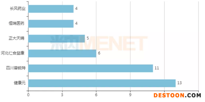 健康元、四川普銳特、河北仁合益康、正大天晴、恒瑞醫(yī)藥、長風藥業(yè)6家企業(yè)申報品種數(shù)達4個及以上。健康元以13個申報品種領跑,其中4個已獲批生產(chǎn);四川普銳特以11個品種緊接其后,其中2個已獲批生產(chǎn)。