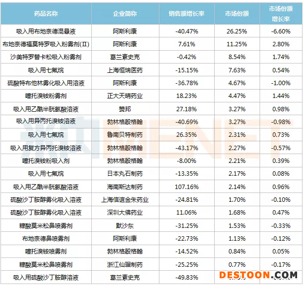 國產(chǎn)品牌有“雄起”的趨勢,恒瑞的吸入用七氟烷排位第四,正大天晴藥業(yè)的噻托溴銨粉霧劑、魯南貝特制藥的吸入用七氟烷、海南斯達制藥的吸入用乙酰半胱氨酸溶液、深圳大佛藥業(yè)硫酸沙丁胺醇霧化吸入溶液增速達10%以上,其中正大天晴藥業(yè)的噻托溴銨粉霧劑市場份額及排位有所上升,海南斯達制藥的吸入用乙酰半胱氨酸溶液增速超100%。