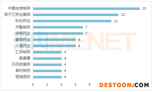 注射劑過評(píng)TOP12企業(yè)(以集團(tuán)計(jì),單位:個(gè))