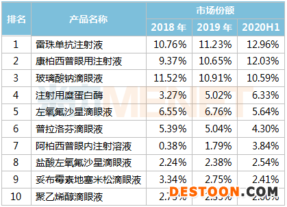 產(chǎn)品TOP10中,雷珠單抗注射液、康柏西普眼用注射液和阿柏西普眼內(nèi)注射溶液3個(gè)是獨(dú)家產(chǎn)品。其中,雷珠單抗注射液、康柏西普眼用注射液、玻璃酸鈉滴眼液在2019年銷售額均超過10億元,2020年上半年均超過5億元。值得注意的是,近年來,康柏西普眼用注射液市場份額快速增長,從2015年的3.77%到2019年突破10%,2020年上半年再創(chuàng)新高,躍升到第二位。