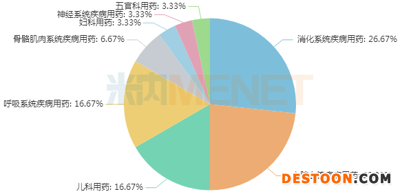 30個(gè)獨(dú)家中成藥涵蓋8個(gè)治療類別,消化系統(tǒng)疾病用藥以26.67%的占比(8個(gè)品種)排在首位,心腦血管疾病用藥以23.33%的占比(7個(gè)品種)緊接其后,兒科用藥、呼吸系統(tǒng)疾病用藥以16.67%的占比(5個(gè)品種)并列第三。