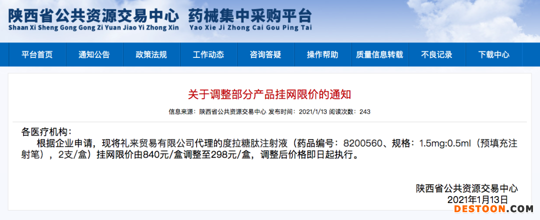 1月15日訊 1月13日,陜西省公共資源交易中心發(fā)布通知稱(chēng),根據(jù)企業(yè)申請(qǐng),現(xiàn)將禮來(lái)度拉糖肽注射液(1.5mg:0.5ml 預(yù)填充注射筆,2支/盒)掛網(wǎng)限價(jià)由840元/盒調(diào)整至298元/盒,即每支149元。降幅超64.5%!