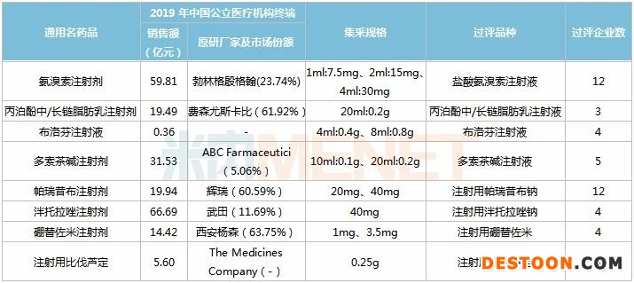 米內(nèi)網(wǎng)數(shù)據(jù)顯示,45個通用名藥品在2019年中國城市公立醫(yī)院、縣級公立醫(yī)院、城市社區(qū)中心以及鄉(xiāng)鎮(zhèn)衛(wèi)生院(簡稱中國公立醫(yī)療機(jī)構(gòu))終端合計(jì)銷售額550億元,其中有21個藥品銷售額超過10億元,泮托拉唑注射劑以66.7億元領(lǐng)跑,氨溴索注射劑以59.8億元緊接其后。