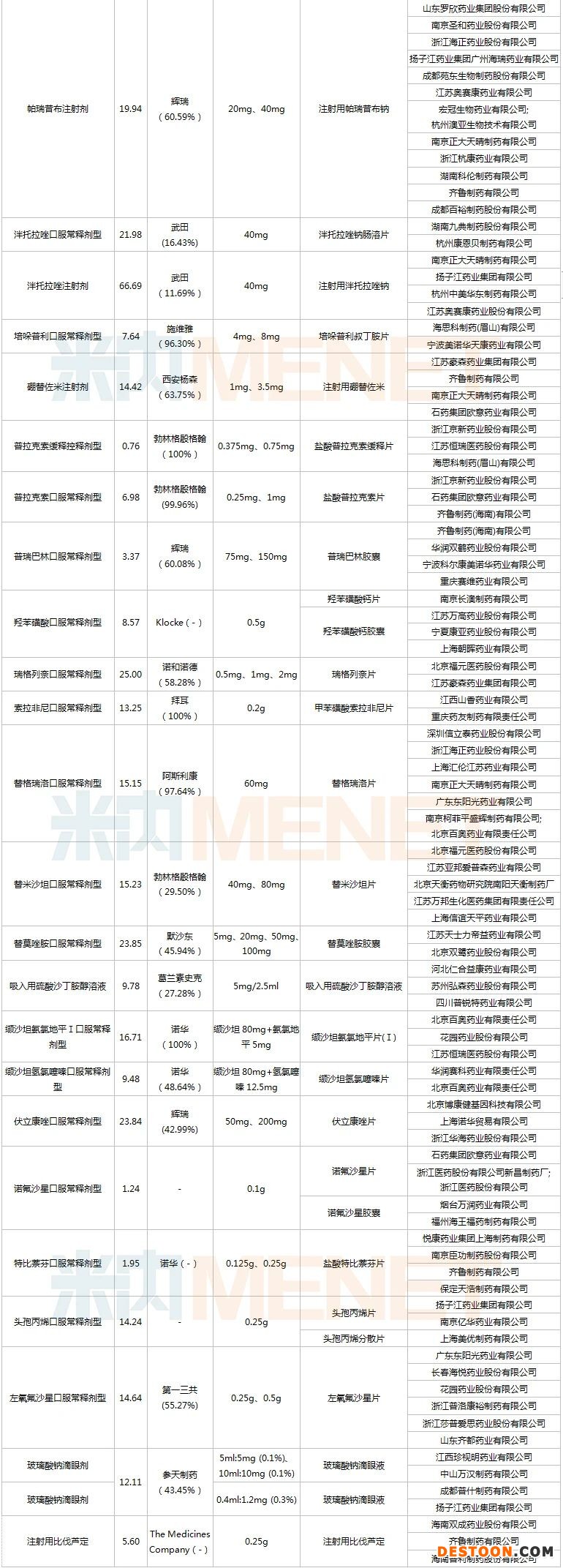 此前流傳版本納入44個品種90個品規(guī),正式文件為45個品種80個品規(guī)。經(jīng)比對,玻璃酸鈉滴眼劑5ml:5mg (0.1%)、10ml:10mg (0.1%)與玻璃酸鈉滴眼劑0.4ml:1.2mg (0.3%)分列為兩個品種。此外,多索茶堿注射劑少了10ml:0.2g、20ml:0.3g兩個規(guī)格、氯雷他定少了5mg規(guī)格、那格列奈口服常釋劑型少了30mg規(guī)格、培哚普利少了2mg規(guī)格、羥苯磺酸少了0.25g規(guī)格、吸入用硫酸沙丁胺醇少了0.1g/20ml規(guī)格、替米沙坦少了20mg規(guī)格、頭孢丙烯少了0.125g、0.5g兩個規(guī)格。