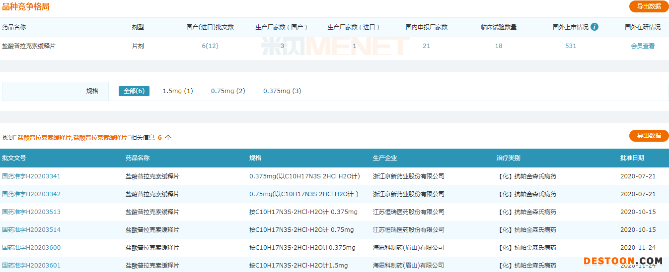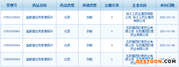 鹽酸普拉克索緩釋片生產(chǎn)企業(yè)有江蘇恒瑞醫(yī)藥、海思科制藥(眉山)、浙江京新藥業(yè)3家國(guó)內(nèi)企業(yè),均在2020年下半年以仿制4類獲批,并視同過評(píng)。今年以來,揚(yáng)子江藥業(yè)集團(tuán)和石藥集團(tuán)歐意藥業(yè)提交上市申請(qǐng)?jiān)趯徳u(píng)審批中(在藥審中心),在此之前,成都百裕制藥、成都康弘藥業(yè)集團(tuán)、成都倍特藥業(yè)、齊魯制藥(海南)等企業(yè)已提交上市申請(qǐng)?jiān)趯徳u(píng)審批中(在藥審中心)。