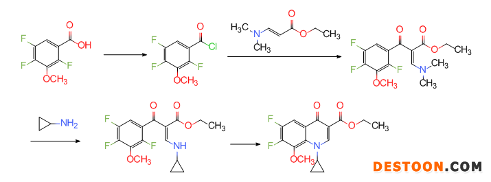 片段二為8-甲氧基氟喹諾酮類(lèi)結(jié)構(gòu),以1-環(huán)丙基-6,7-二氟-1,4-二氫-8甲氧基-4-氧代-3-喹啉羧酸乙酯(CAS:112811-71-9)起始原料反應(yīng)制得,其合成路線(xiàn)如下: