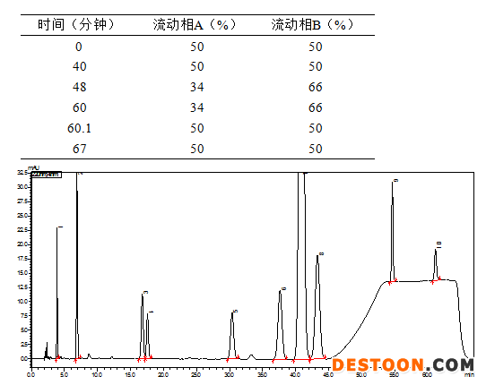 柱溫40℃;檢測(cè)波長(zhǎng)220nm;流速1ml/min;進(jìn)樣量20μl;供試品濃度:1mg/min