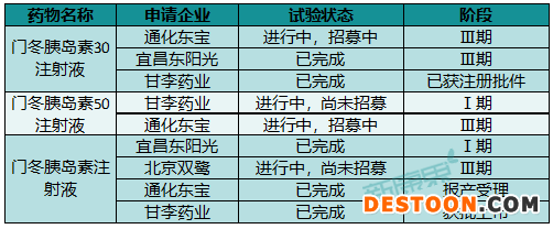 從門(mén)冬胰島素研發(fā)進(jìn)展來(lái)看,甘李藥業(yè)、通化東寶、宜昌東陽(yáng)光等藥企跑在前面。其中,甘李藥業(yè)已經(jīng)獲得門(mén)冬胰島素30注射液注冊(cè)批件,東陽(yáng)光已經(jīng)完成三期試驗(yàn);通化東寶則在進(jìn)行門(mén)冬胰島素50注射液三期試驗(yàn)。
