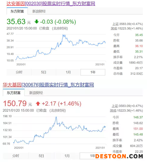 整個(gè)2020年,中國(guó)抗疫在中華民族史冊(cè)、人類(lèi)發(fā)展史冊(cè)上寫(xiě)下悲壯雄渾的篇章,大規(guī)模開(kāi)展核酸和抗體檢測(cè)發(fā)揮著至關(guān)重要的作用。同時(shí),資本市場(chǎng)也助推檢測(cè)試劑廠商站上了風(fēng)口,以達(dá)安基因、萬(wàn)孚生物、華大基因、明德生物、麗珠集團(tuán)等上市公司為代表,股價(jià)在過(guò)去的一年掀起了巨大漲幅。