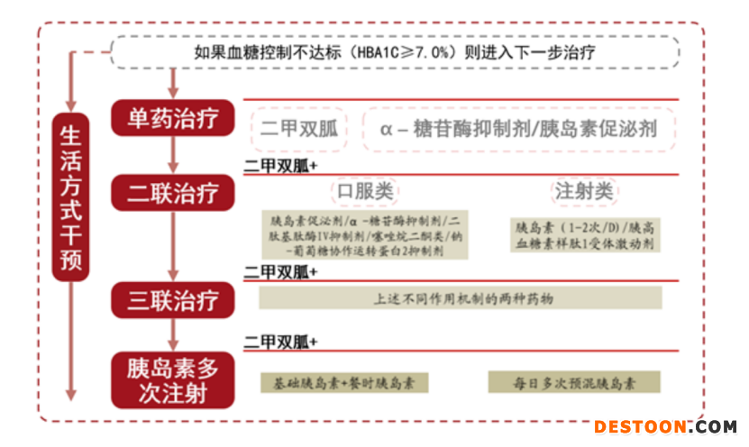 根據(jù)我國(guó)《關(guān)于糖尿病的新診斷標(biāo)準(zhǔn)與分型》,對(duì)于糖尿病人的診療方式分為4個(gè)階段,第一階段是單藥治療,如果血糖控制不達(dá)標(biāo)則進(jìn)入下一步治療,即二甲雙胍+進(jìn)行二聯(lián)治療、三聯(lián)治療甚至胰島素多次注射。其中,二甲雙胍+GLP-1為二聯(lián)治療方案之一。