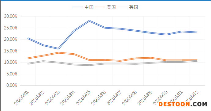 2020年,歐盟與中國實(shí)現(xiàn)貿(mào)易總額5860.32億歐元,同比增長4.46%,中國在歐盟對外貿(mào)易總額中占比達(dá)到16.07%,同比上升2.3個(gè)百分點(diǎn),中國成為歐盟最大貿(mào)易伙伴。美國和英國在歐盟對外貿(mào)易總額中占比分別為15.22%和12.20%,為歐盟第二大和第三大貿(mào)易伙伴。中國在疫情最為嚴(yán)重的2、3月份降為歐盟第三大貿(mào)易伙伴;4月份,隨著中國復(fù)工復(fù)產(chǎn)復(fù)市的推進(jìn),以及疫情在全球范圍內(nèi)的擴(kuò)散,中國一躍成為歐盟第一大貿(mào)易伙伴,并維持至2020年12月。美國則由4月開始降為歐盟第二大貿(mào)易伙伴,直至2020年結(jié)束。